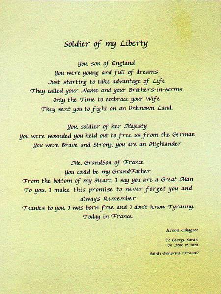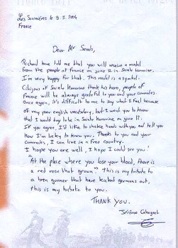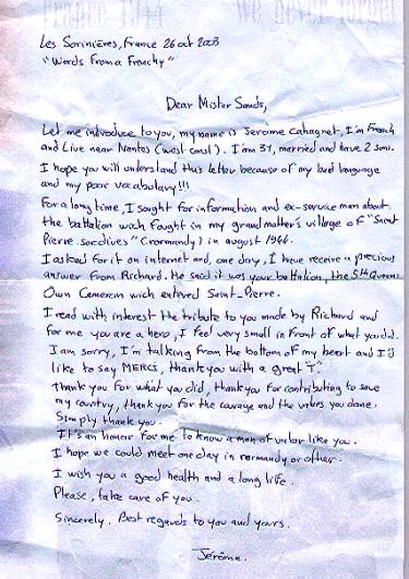 ![]() | The letter (left), was sent to George Sands in October 2003, as a result of Jerome Cahagnet asking a question on the Scottish Military History forum page. He wanted to know which Scottish regiment liberated his Grandmothers village, Sainte Pierre sur Dives in 1944. The letter reads as follows: Dear Mr Sands, Let me introduce to you, my name is Jerome Cahagnet, I'm French and live near Nantes(west coast). I am 31, married and have 2 sons. I hope you will understand this letter because of my bad language and my poor vocabulary!!! For a long time, I sought information and ex-service man about the battalion which fought in my Grandmothers village of Saint Pierre sur Dives (Normandy) in August 1944. I asked for it on internet and, one day, I have receive a precious answer from Richard. He said it was your battalion, 5th Queens Own Cameron which entered Saint-Pierre. I read with interest the tribute to you made by Richard and for me you are a hero. I feel very small in front of what you did. I am sorry, I'm talking from the bottom of my heart and I'd like to say Merci, thankyou with a great "T". Thankyou for what you did, thankyou for contributing to save my country,