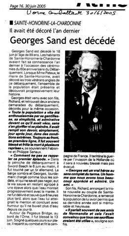 Georges était venu avec son fils, Richard, et retrouvait 2 anciens camarades du débarquement décorés pour la même occasion. Toute la population fut vite enthousiasmée par sa gentillesse, sa simplicité, et vite admirative devant ce qu’il avait vécu, sans s’en glorifier ni s’en plaindre. Il avait rempli son devoir, simplement, jour après jour dans des conditions extrêmes. Toujours au front, en première ligne, il fut souvent blessé et frôla la mort à plusieurs reprises. Comment ne pas se rappeler ce premier épisode, lorsque dans la péniche de débarquement à « Sword beach » le 6 juin au matin, il fut touché par un tir allemand. La barge sombra et Georges, lourdement chargé comme tous les soldats, et qui ne savait pas nager, eut la vie sauve en restant agrippé à une épave alors que l’eau montait progressivement avec la marée. Il ne fut délivré et sauvé que 6 h plus tard alors que l’eau lui atteignait le menton et concluait avec humour « qu’il ne buvait plus d’eau depuis ce jour là » ! En première ligne autour de « Pegadus bridge » au bord de l’Orne, il fut blessé le 13 juin à la joue et à la jambe à Ste-Honorine la chardonneret. Soigné quelques jours sur place, il repartit au combat et fit la campagne de France. Il termina la guerre par l’invasion de la Hollande où il sera à nouveau blessé mais pas évacué. Il se souvenait que les allemands minaient les cadavres de leurs ennemis, ce qui au début au moins, a augmenté le nombre des victimes parmi ses jeunes camarades alliés qui allaient ramasser les corps. Georges, un vrai héros au sens complet du terme. Un homme que nous avons tous beaucoup apprécié et admiré. Un ami. Son fils Richard, nous annonçant la triste nouvelle, nous dit combien son père avait été heureux de ce retour en Normandie libérée, et témoigne « I would like to thank you for making his last year such a memorable and happy one. He spoke often of "His friends in Normandy" and convinced him that all the sacrifices were worthwhile.”c’est à dire “je voudrais vous remercier d’avoir permis que sa dernière année soit si mémorable et heureuse. Il parlait souvent de ses amis de Normandie et cela l’avait convaincu que tous ces sacrifices avaient été utiles ». Oh oui, combien utiles. C’est à des hommes comme toi que nous devons notre liberté. Adieu Georges. Tes amis normands si reconnaissants. Philippe et Fabienne Senaux A true hero passed away.... Translation by Philippe Senaux